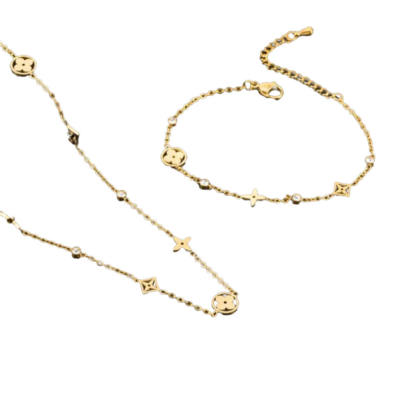 Elegante set composto da collana e bracciale in acciaio al titanio, impreziosito da un raffinato design geometrico. Realizzata con tecnologia galvanica, conferisce luminosità e durata nel tempo. Perfetto per donne che amano distinguersi con stile, sia nella quotidianità che nelle occasioni speciali.